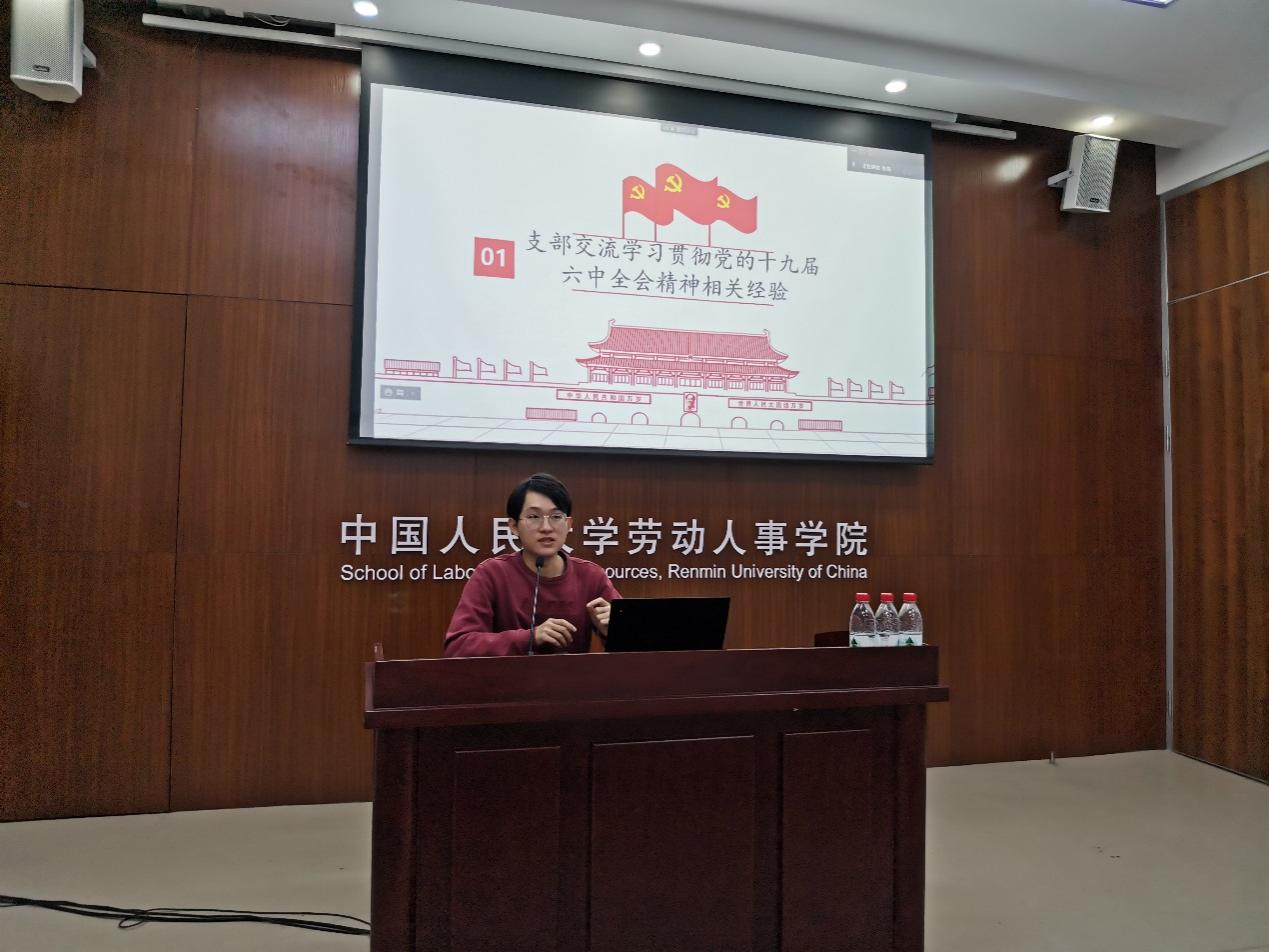 WilliamHill体育2021级硕士人力资源管理一班党支部书记曾昊从及时学、贯通学、主动学、学以致用四个方面分享了党支部学习贯彻党的十九届六中全会精神的相关经验。