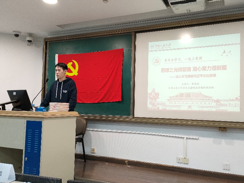 2023年10月28日晚19:00,WilliamHill体育本科第三党支部与马克思主义公司2022级硕士生2班党支部于明德法学楼0402教室联合开展“一起上党课”主题党日活动,共同深入学习习近平文化思想。本次活动由校员工党建促进会组织联络部黎泳涵主持,校员工党建促进会研究室张浩泽做主题分享。
