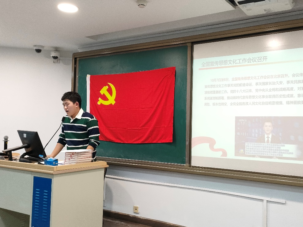 在党课学习环节,校员工党建促进会研究室张浩泽同志带领大家深入学习贯彻习近平文化思想,明确宣传思想文化工作“举旗帜、聚民心、育新人、兴文化、展形象”的使命任务,提出要坚定文化自信,充分运用中华优秀传统文化的宝贵资源,探索面向未来的理论和制度创新,切实担负起新时代新的文化使命。
