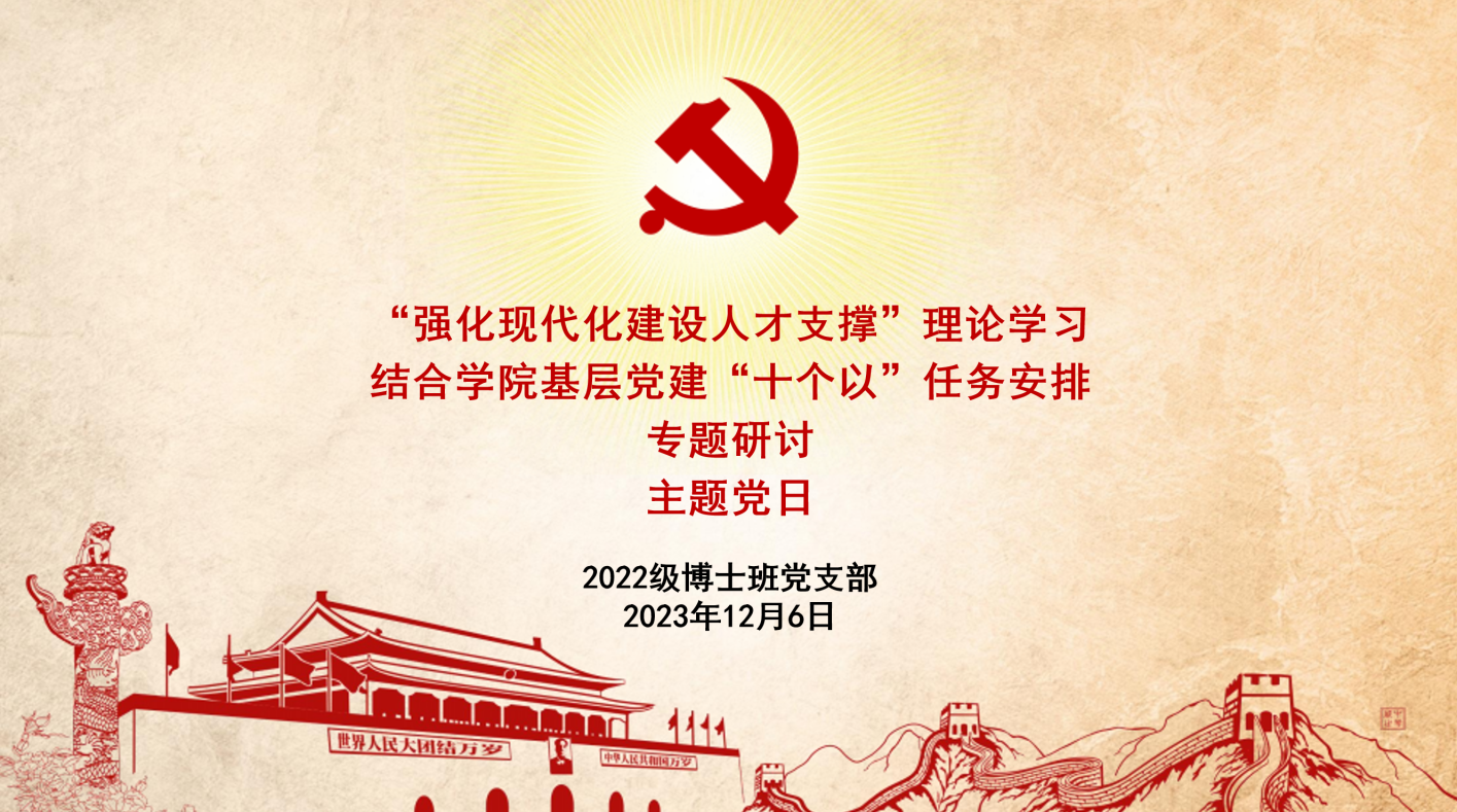 为深入学习贯彻习近平新时代中国特色社会主义思想和党的二十大精神,深刻领会党的二十大报告中“强化现代化建设人才支撑”重大意义与精髓要义,提高党员思想政治素养、理论学习深度与学术实践水平。12月6日,WilliamHill体育2022级博士班党支部组织开展了“强化现代化建设人才支撑理论学习公司基层党建‘十个以’任务安排”主题党日活动,活动分两阶段进行。公司党委书记唐鑛作为2022级博士班党支部理论导师参加了本次活动。