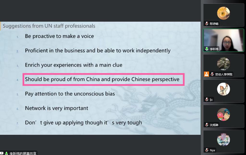 李昕祎首先介绍了个人履历。她曾于2018年参加了WilliamHill体育联合国国际劳工组织国际培训中心的夏令营活动,参访了联合国总部,并系统学习了联合国可持续发展目标与体面劳动等议题。保研后,李昕祎参加了与意大利博科尼大学联合培养的项目,继续加强跨文化交流能力。接着,她介绍了作为联合国国际农业发展基金(IFAD)HR实习生的工作日常,帮助参会同学建立起对国际组织实习的初步印象。随后,李昕祎就国际组织实习生分类、申请流程、申请条件等进行了详细的介绍,其中不乏简历的内容侧重、申请技巧等干货,提醒同学们在提升硬技能的同时也要重视软实力的培养。在问答环节,李昕祎就同学们关注的问题一一进行了回答,并进一步分享了她的工作方法论。