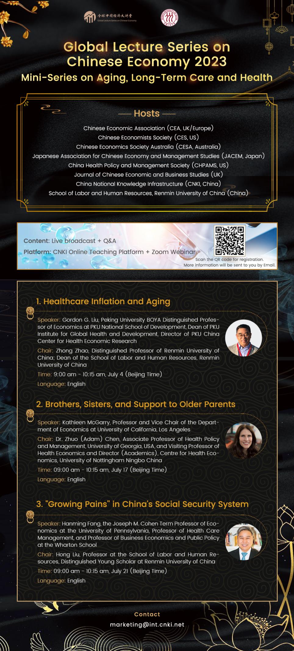 The Global Lecture Series on Chinese Economy 2023 is jointly organized by the School of Labor and Human Resources, Renmin University of China, China Economic Association (CEA,UK/Europe), Chinese Economists Society (CES,US), Chinese Economists Society Australia (CESA,Australia), Japanese Association for Chinese Economy and Management Studies (JACEM,Japan), China Health Policy and Management Society (CHPAMS,US), Journal of Chinese Economic and Business Studies (UK), and China National Knowledge Infrastructure (CNKI, China). The lecture hall will be held from July 4-21, 2023. The theme for 2023 will be "Aging, long-term Care and Health".