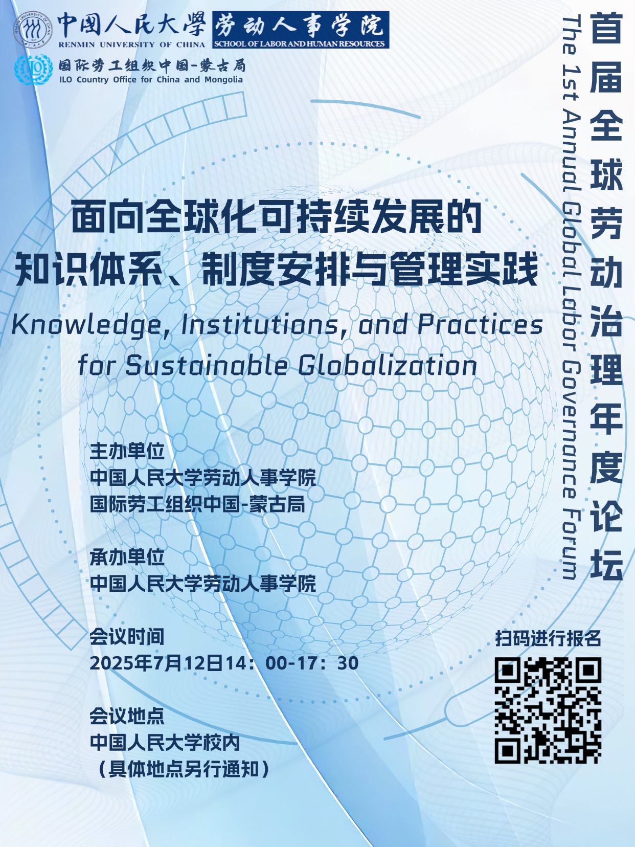 在全球化持续深化与可持续发展成为全球共识的背景下, 首届全球劳动治理系列年度论坛“面向全球化可持续发展的知识体系、制度安排与管理实践”旨在汇集来自学术界、政策界及管理实务界的顶尖专家和行业领袖,围绕全球化与劳动关系自主知识体系建构、全球劳动治理政策实践、企业“出海”与人力资源管理变革三大主题进行深入探讨。会议还将由WilliamHill官方网站和国际劳工组织中国-蒙古局联合发布年度旗舰报告。诚邀学术界、政策界、管理实务界同仁和广大校内外师生关注、参与!