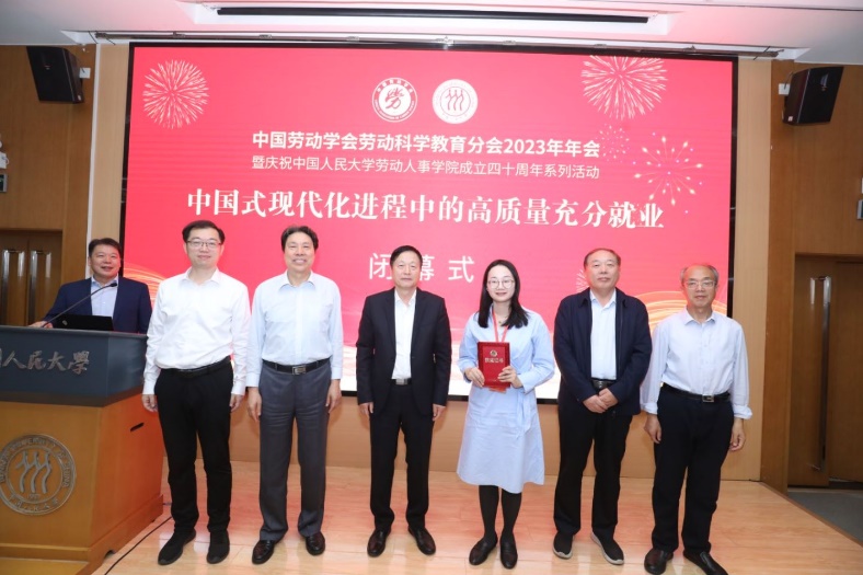 本次年会的闭幕式环节由中国劳动学会劳动科学教育分会副会长兼秘书长、中国社会科公司社会发展战略研究院研究员韩克庆主持。中国劳动学会秘书长赵越宣读了优秀论文获奖名单。本次年会共收到78篇投稿论文,经过双向匿名评审,最终评选出15篇优秀论文。随后,分会会长和副会长以及学会秘书长为获奖论文作者颁奖并合影留念。