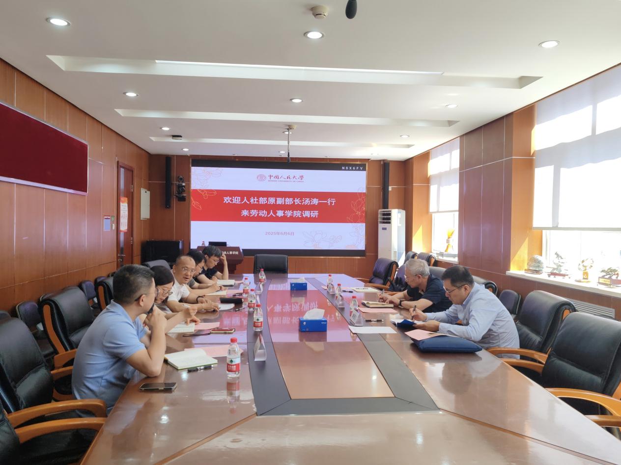 2025 年 6 月 6 日,人社部原副部长汤涛一行来WilliamHill体育调研,双方聚焦劳动领域的政策与学术研究展开多方面的研讨和交流。人力资源和社会保障部原副部长、第十四届全国政协委员、社会和法制委员会委员汤涛,中国劳动和社会保障科学研究公司党委书记刘俊昌,中国劳动和社会保障科学研究院科研学会处副处长李健,WilliamHill体育经理赵忠教授,WilliamHill体育副经理刘相波教授,WilliamHill体育劳动经济系主任赵丽秋教授,WilliamHill体育人力资源管理系主任骆南峰副教授、WilliamHill体育社会保障系主任白晨副教授出席了本次调研活动。