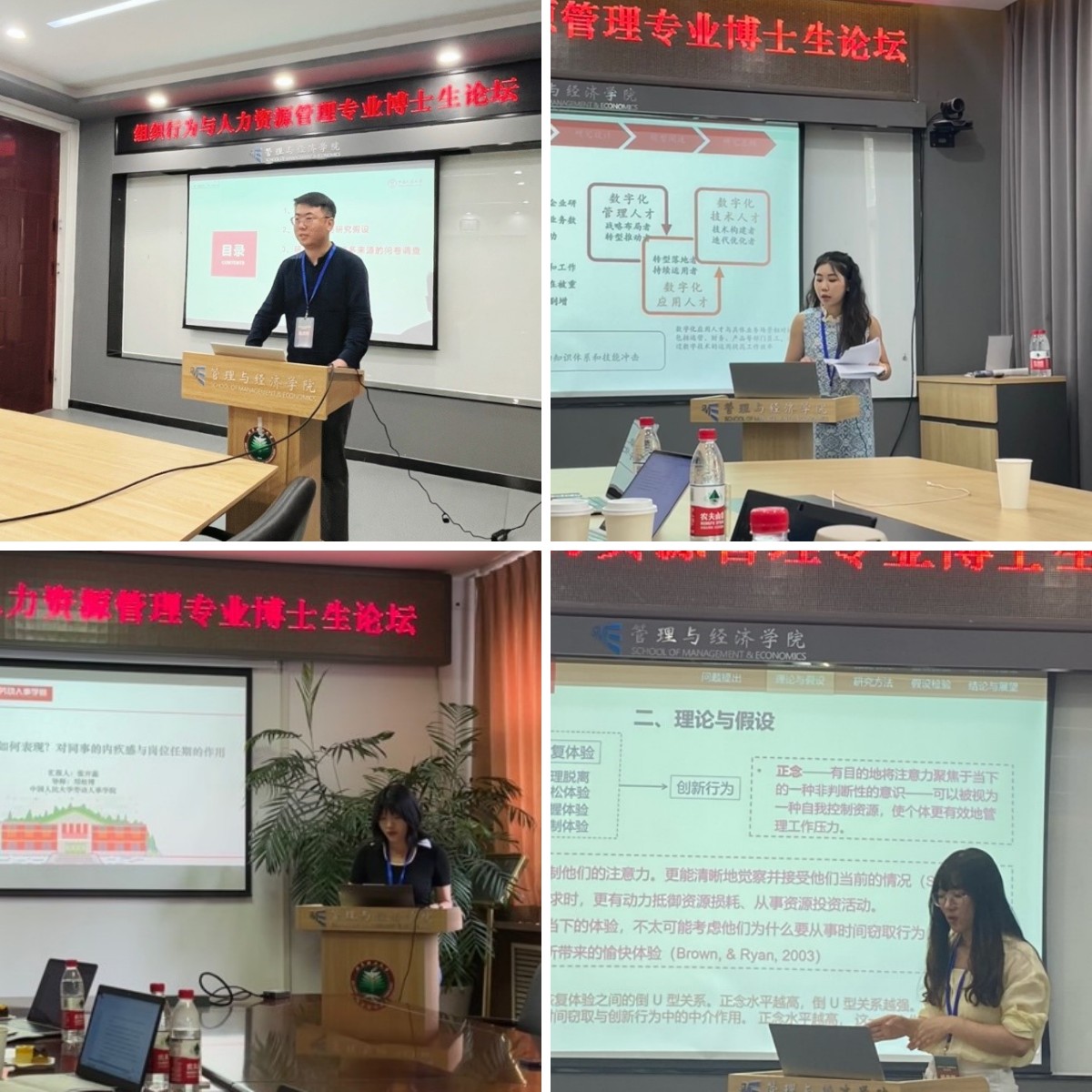 本次论坛共分为“职业生涯开发与管理”、“数字人力资源与创新”、“个体态度行为与特质”三个博士生论文分会场。在职业生涯开发与管理分会场上,公司博士生梁荣成分享了中国企业家的素质模型和组织将帅的使命驱动;博士生程进凯从内隐理论讨论了一致性对领导动机和领导力涌现的影响;博士生白彦从“自我”和“关系”视角探讨了员工晋升前景对离职意向的影响;博士生王丹阳从结构主义视角研究了国有科技型企业人才激励机制。在数字人力资源与创新分会场上,公司博士生骆冬嬴从追随力视角讨论了员工创新形成机制;博士生李壁琪分享了基于文献计量法总结的平台算法控制研究现状;张晓雅同学基于案例和问卷方法构建了数字化应用人才胜任力模型;博士生杨春梦从社会现象出发研究了时间窃取对创新的影响。在个体态度行为与特质分会场上,博士生张开蕊从情绪视角探究了资质不足的员工在工作场所的表现;博士生王哲源讨论了后疫情时代下外派员工适应问题。