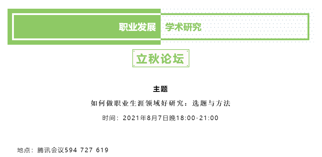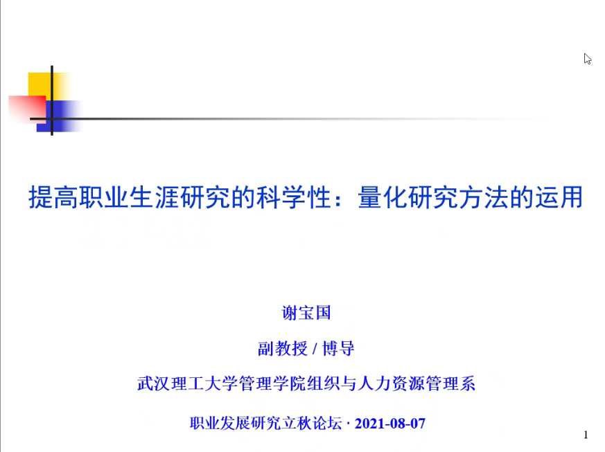 WilliamHill体育职业开发与管理系、劳动经济学会职业开发与管理分会、WilliamHill体育组织行为学研究所和武汉理工大学管理公司组织与人力资源管理系主办的2021年职业发展立秋论坛暨职业研究沙龙(第9期)于2021年8月7日(星期六)晚上18:00至21:30借助腾讯会议的线上途径顺利开展。