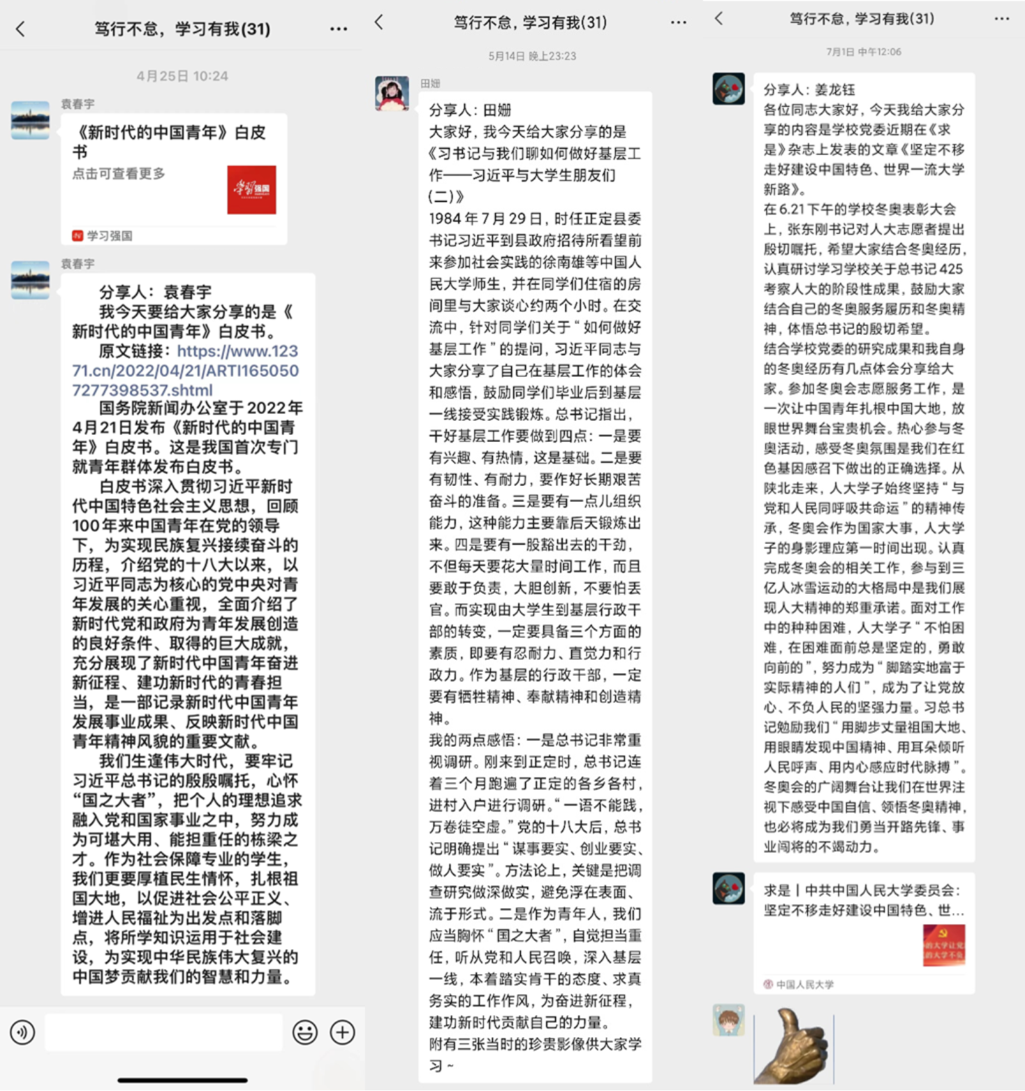 为了加强理论武装、夯实思想根基,WilliamHill体育2021级硕士社会保障班党支部开展了为期四个月的“笃行不怠,学习有我”主题活动。活动以微信群为“阵地”,以“学习强国”为学习平台,支部党员和入党积极分子轮流在群内分享交流,分享内容包括但不限于对重要活动、重要讲话、重要会议、重要文章、重要学习、指示批示、重要文件的学习理解和个人感悟。