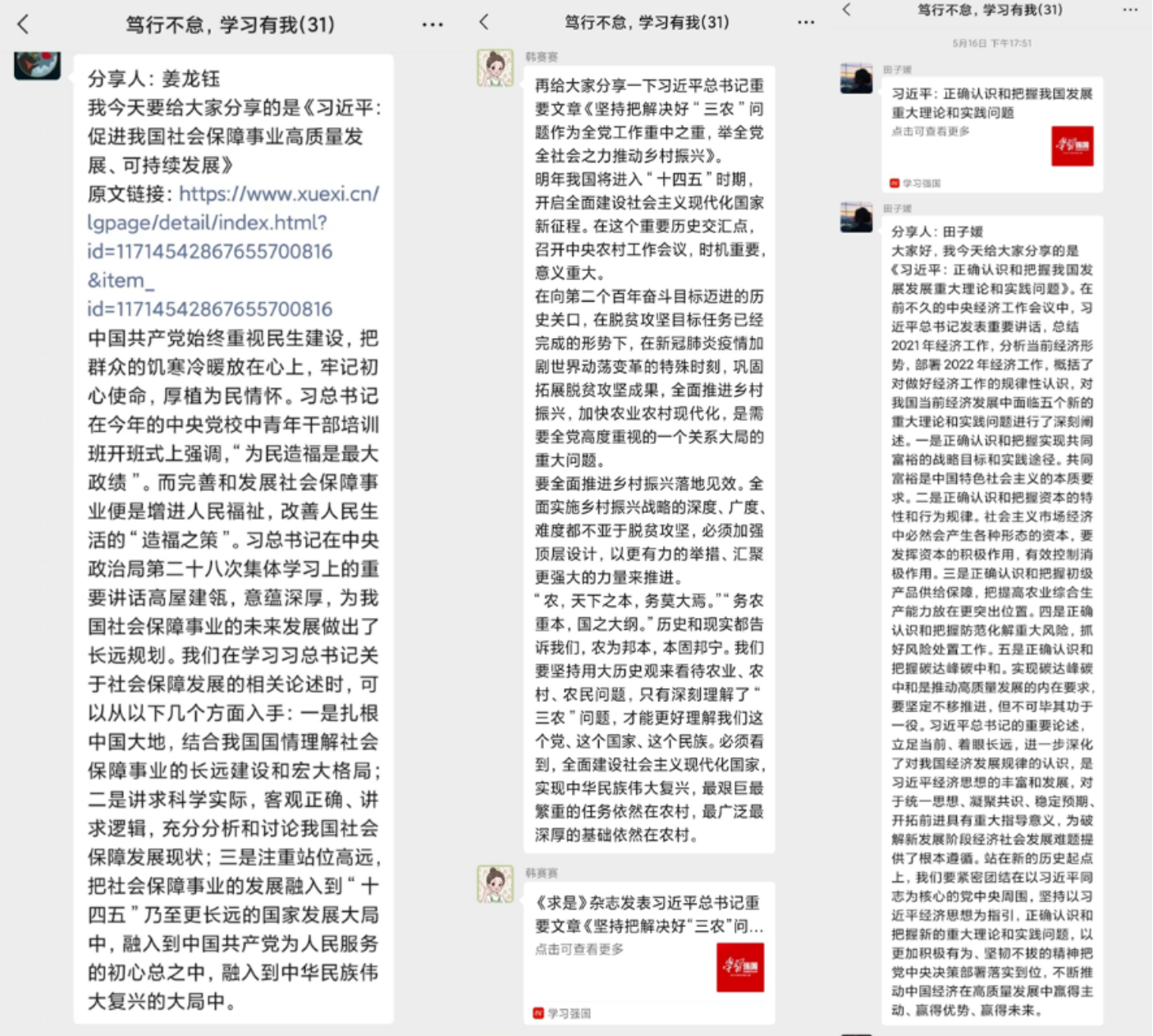 三是着眼现实,学习习近平总书记对关系党和国家事业发展的现实问题提出的新思想、新观点、新论断、新举措。支部成员分享了习近平总书记的重要文章《促进我国社会保障事业高质量发展、可持续发展》《正确认识和把握我国发展发展重大理论和实践问题》等。分享内容做到了立足国情、关照现实,支部成员进一步明确了发力方向,立志将学术研究写在祖国大地上。