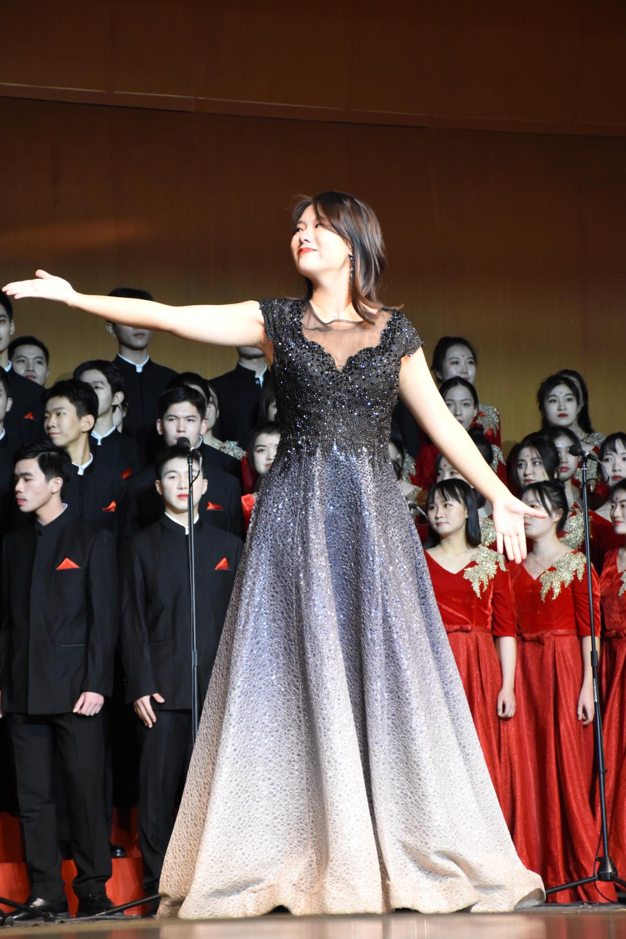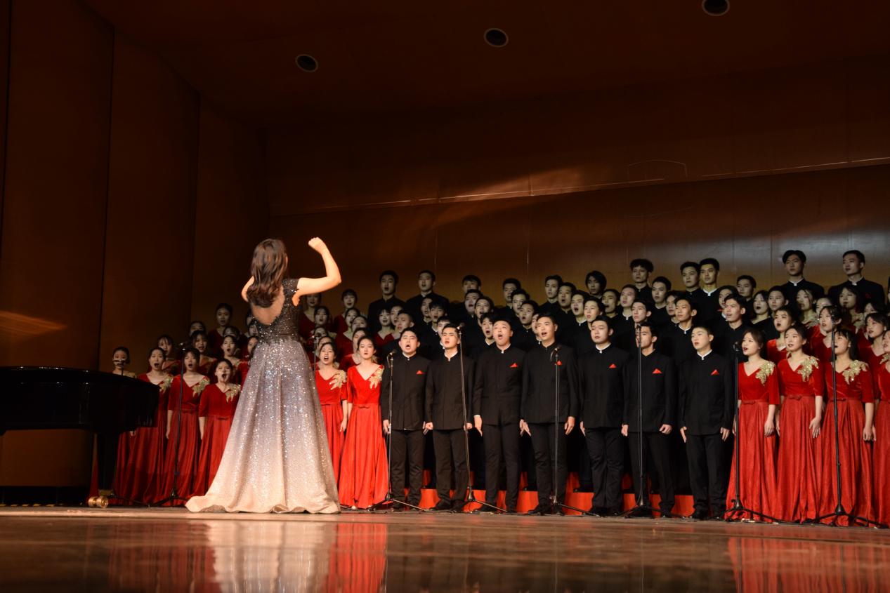 16:00,明德堂灯光骤暗,公司合唱队员在掌声中走上舞台,2019级本科生刘奕池担任本次指挥,2021级硕士研究生贾思淼负责本次钢琴伴奏。钢琴重现岁月,共鸣幽深“百年”。一曲悠扬婉转的《星火》,似是遥远追忆,似是激昂誓言。五百年的理想,不灭的星火,热血澎湃,坚定执着;一路坎坷,回首波澜壮阔,余音绕梁,仍记青春中国!