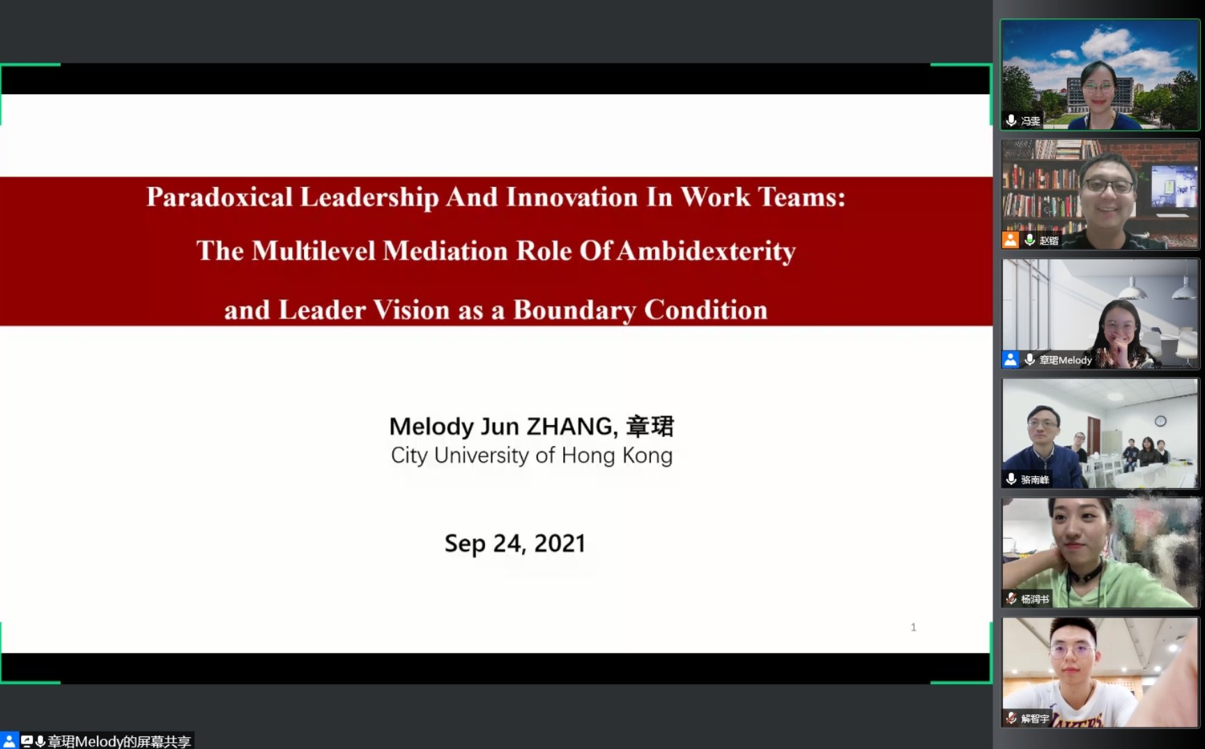 WilliamHill体育人力资源管理系2021年秋季学期半月谈学术论坛(第90期)于2021年9月24日(星期五)下午15:00至17:30采取线上腾讯会议的形式进行。来自香港城市大学商公司管理学系助理教授章珺老师分享了自己今年被Academy of Management Journal(《管理学会会刊》)接收的关于悖论型领导对个体及团队创新影响的研究论文。本次学术论坛由WilliamHill体育赵锴副教授主持,孙健敏教授、苏中兴教授、王桢教授、王丽娟副教授、王青副教授、骆南峰副教授、陈雯助理教授、李海蓉助理教授、冯雯助理教授,以及人力资源管理系近四十位博士生和硕士生参与了此次线上讲座和讨论。