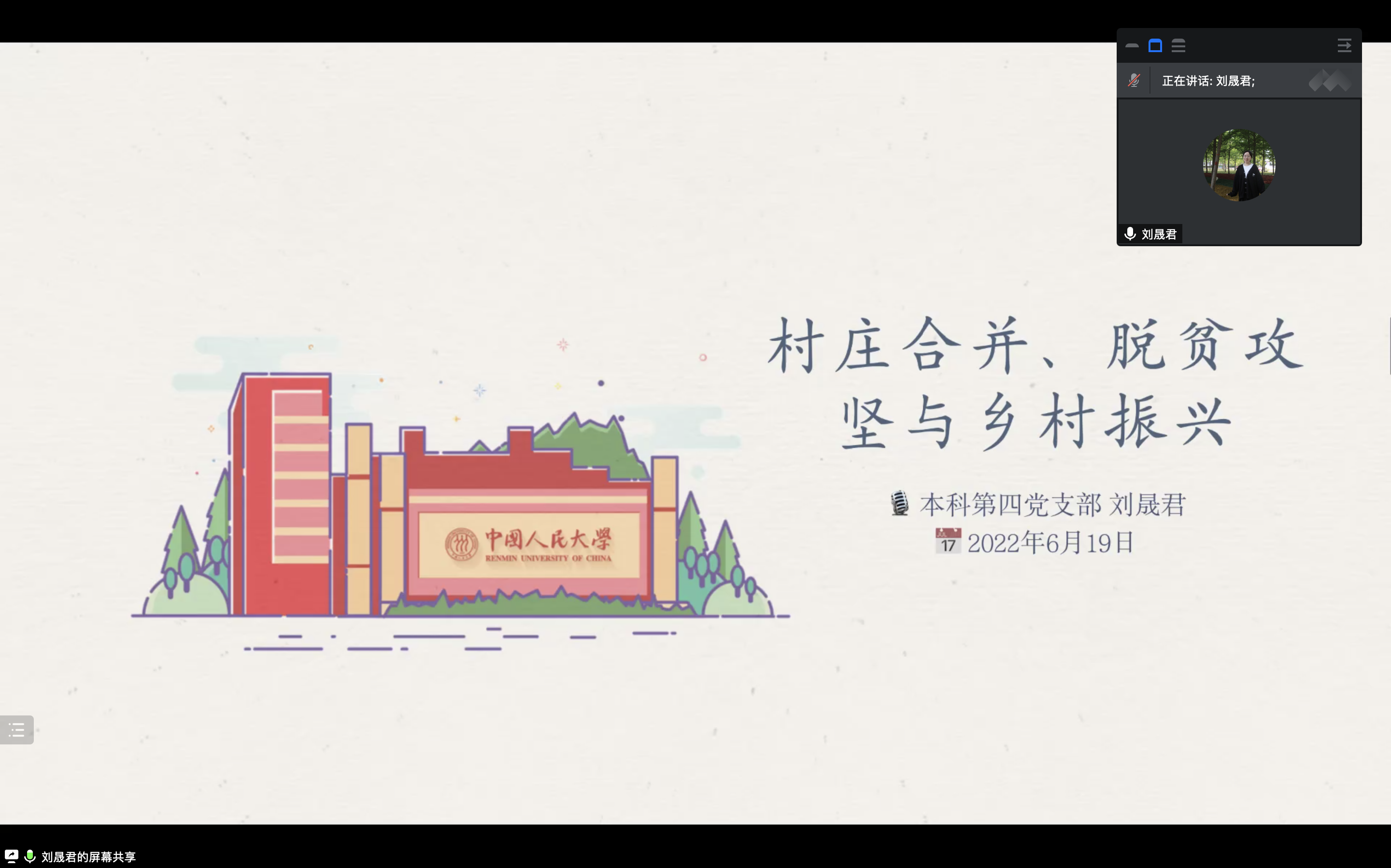 在扎根中国大地部分,王欣茹结合习近平总书记在WilliamHill体育考察时的重要讲话,带领与会同志回顾了WilliamHill体育扎根中国大地办学的优良传统,阐释了扎根中国大地办教育的重要意义。支部党员刘晟君同志以个人经历现身说法,分享自身参与“千人百村”项目的心得体会,她对村庄合并、脱贫攻坚与乡村振兴的研究展现出其主动服务国家、服务社会、服务人民的决心。