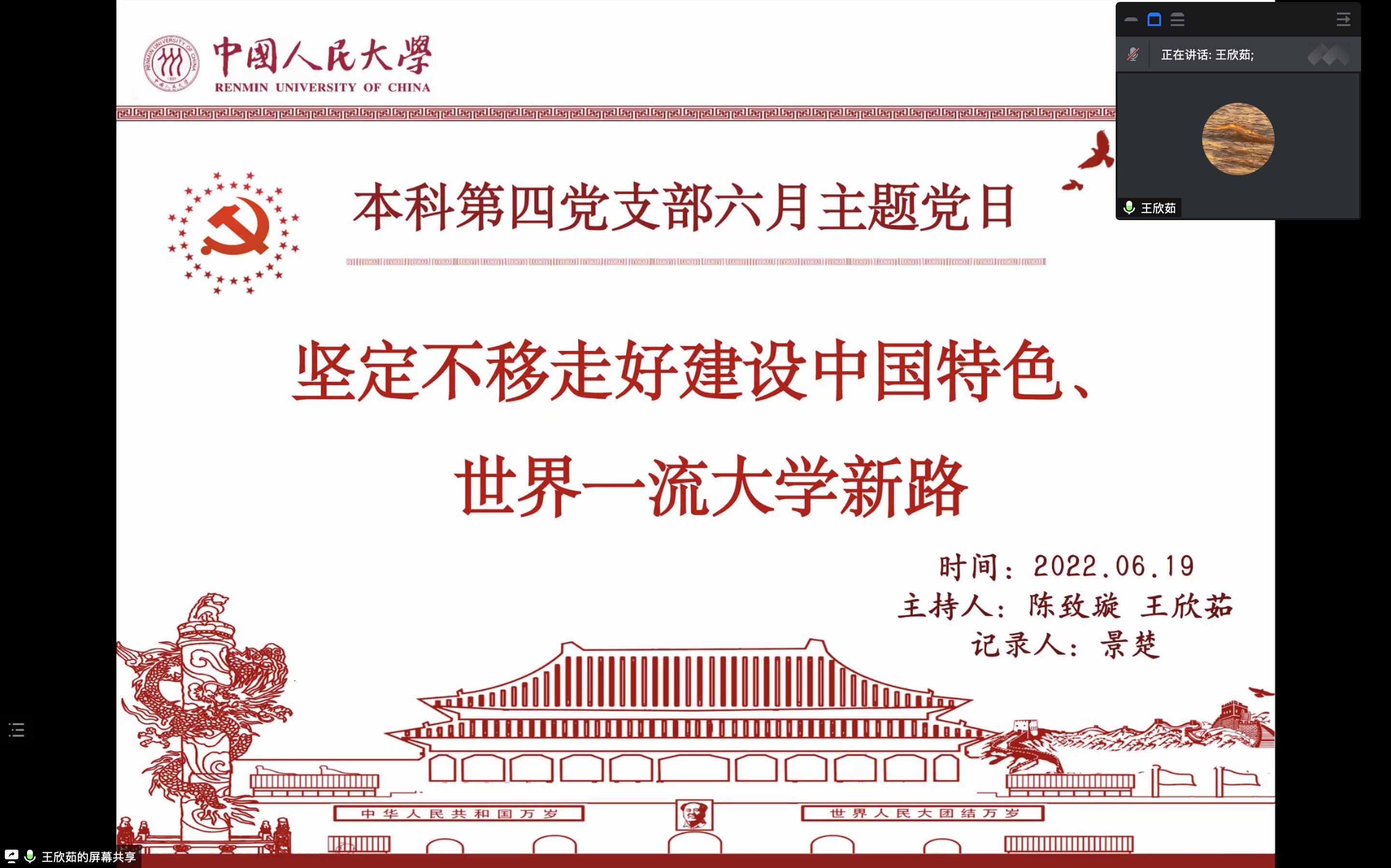 WilliamHill体育本科第四党支部于2022年6月19日20:30通过腾讯会议召开六月主题党日活动。会议内容丰富,形式多样,以《坚定不移走好建设中国特色、世界一流大学新路》原文讲解为主线,从坚持党的全面领导、传承红色基因、扎根中国大地、坚定教育自信四个方面切入,将云游校史展、微党课学习、党员经历分享等环节贯穿其中。会议由支部书记陈致璇和组织委员王欣茹共同主持,支部全体党员和若干积极分子参加会议。