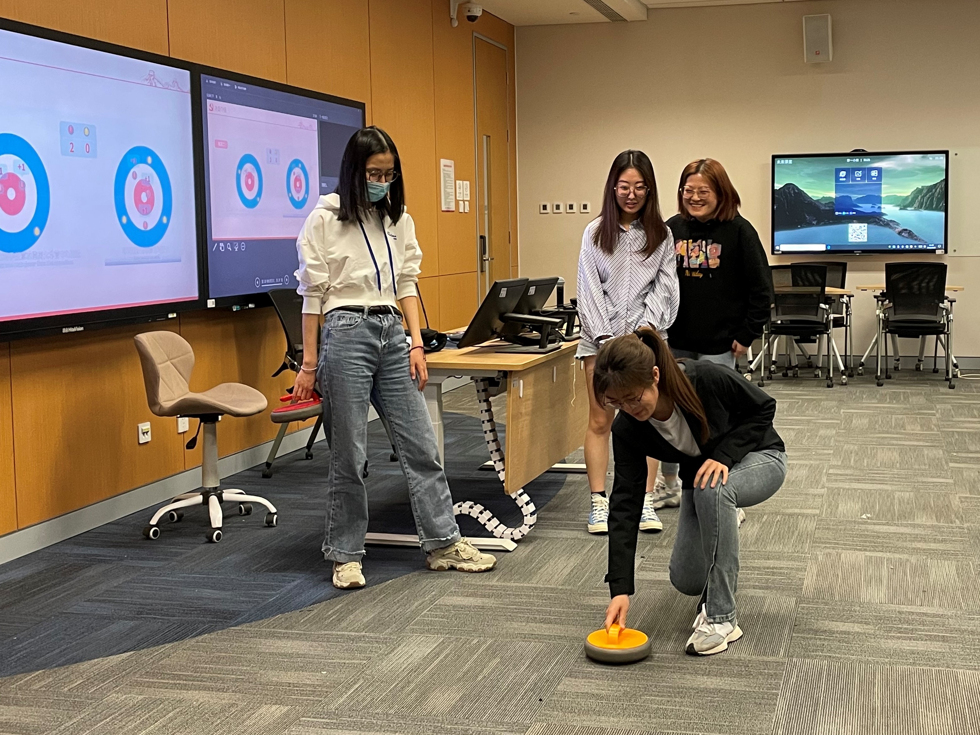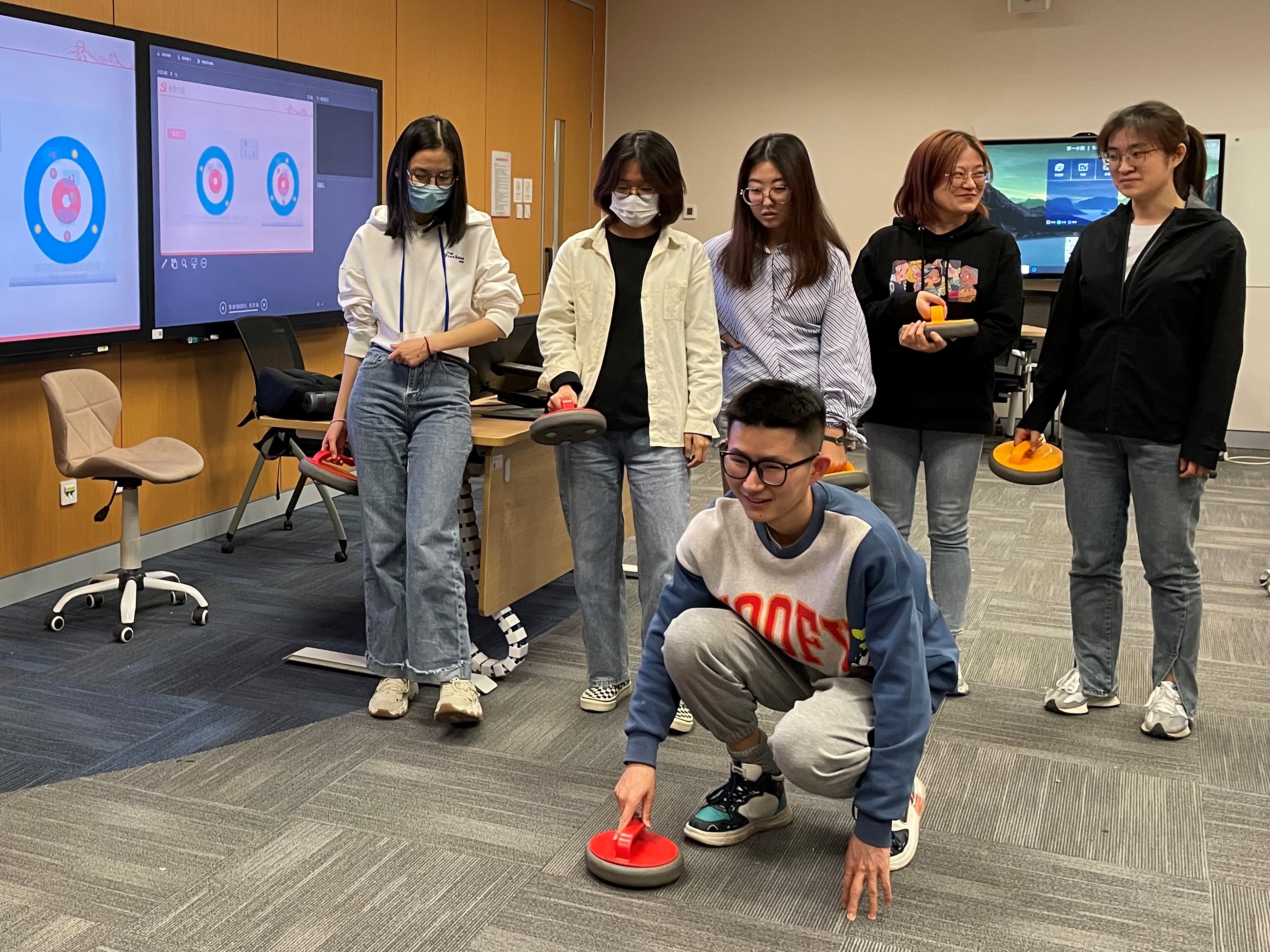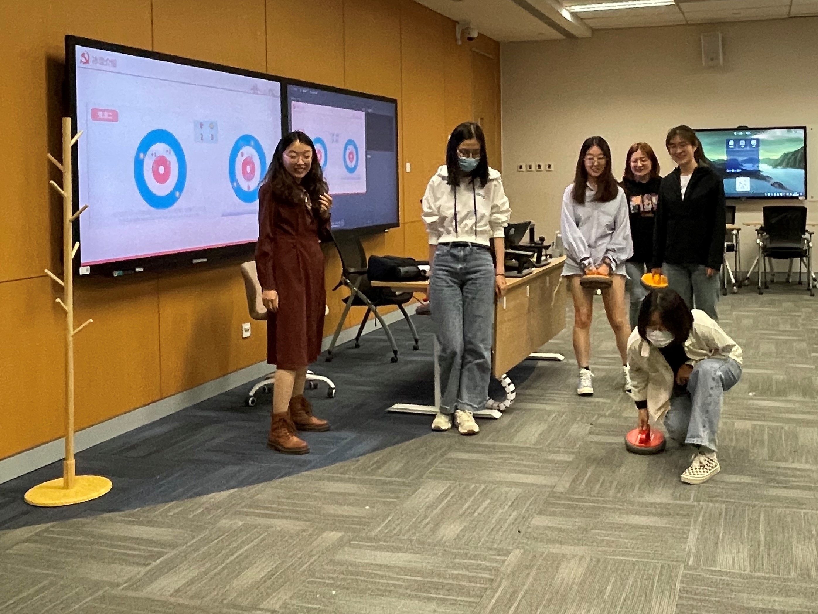 旱地冰壶是冬奥会项目冰壶的普及版,本次主题党日活动设置“旱地冰壶体验”环节,使各位同志能够近距离体验冰雪运动项目,畅享运动激情。与会同志积极参与,开展了一场旱地冰壶挑战赛。红黄两队同学兼用技巧与谋略,投壶、击打、传击、占位,努力使自己队伍的冰壶更接近营垒圆心,活动场面气氛热烈,其乐融融。在激烈角逐中,各位同志领略到这项被称为“冰上国际象棋”的项目魅力,深感“更快、更高、更强——更团结”的召唤。