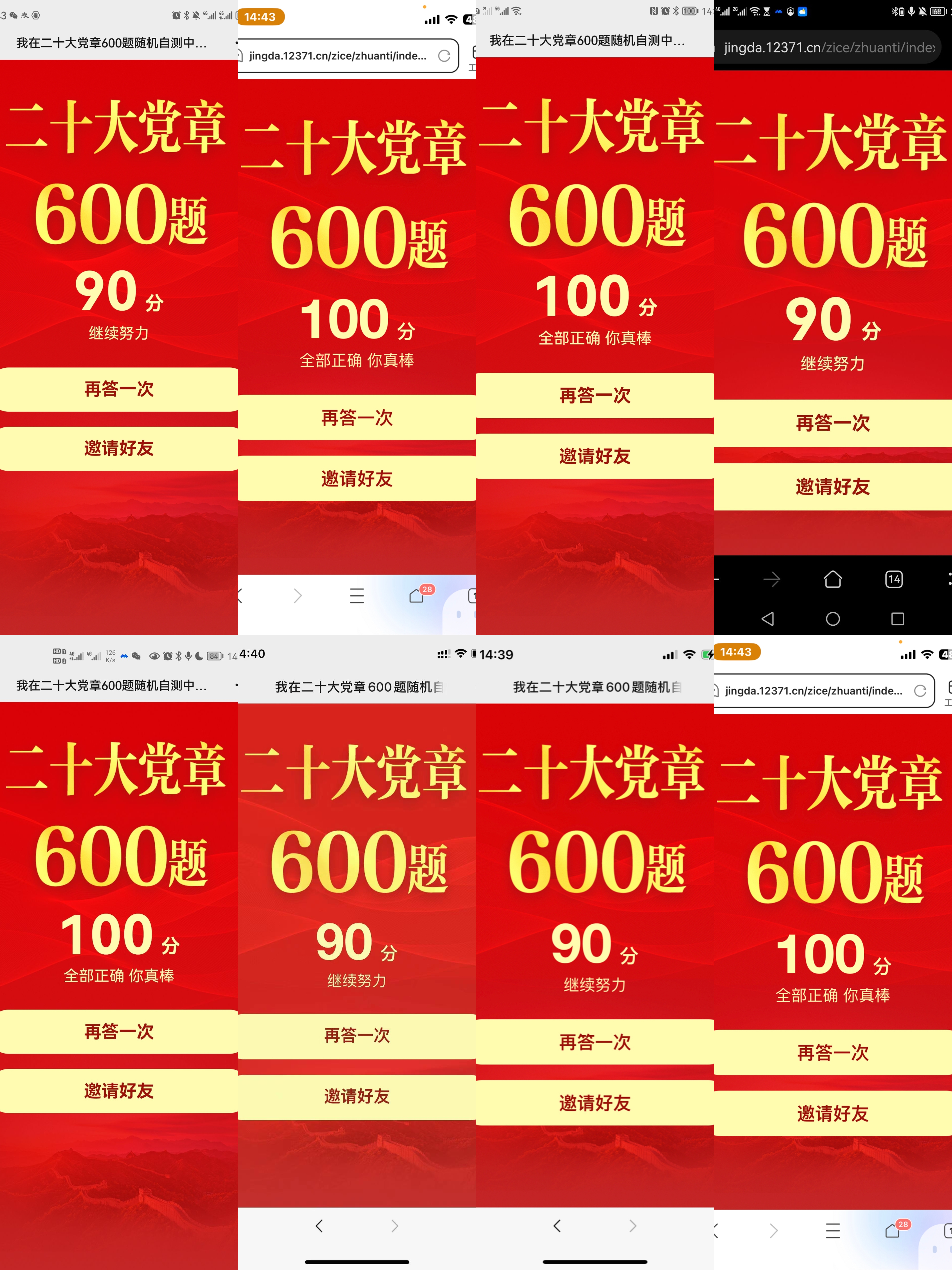 完成党章修正案的理论学习后,与会同志在线参与了《中国共产党章程》的知识自测,通过自测答题进一步巩固学习成果。支部成员积极参与答题,并在会议聊天室内晒出了自己的答题成绩单。通过知识自测,部分同志体会到自己对党章的内容掌握还不够牢固,表示会后一定加强学习。