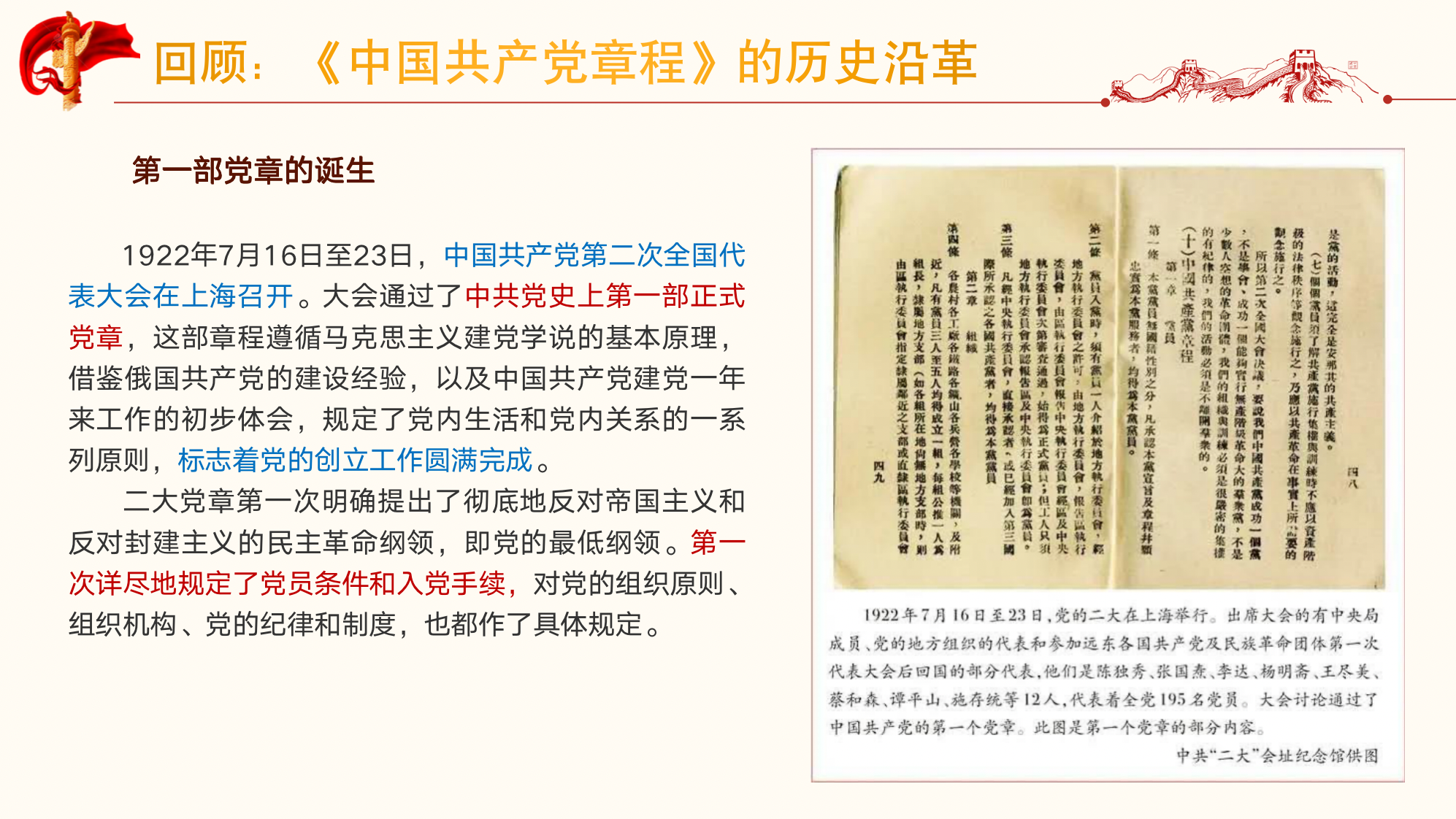 随后,王欣茹带领与会同志回顾《中国共产党章程》的历史沿革。1922年,党的二大制定了党的第一部党章《中国共产党章程》,一百年来,我们党完成了18次党章修改。党的历次代表大会从各个时期党和国家的面临的实际状况出发,通过对党章的修订,确立了党的性质宗旨和党在各个方面发展建设的原则,不断更新完善党的重要思想和重大路线方针政策,并总结了各个时期我们党的建设的经验。《中国共产党章程》的制定与完善史是一部浓缩的党史,也是我们党一步步走向成熟,成为中国革命、建设事业的坚强领导核心的历史。