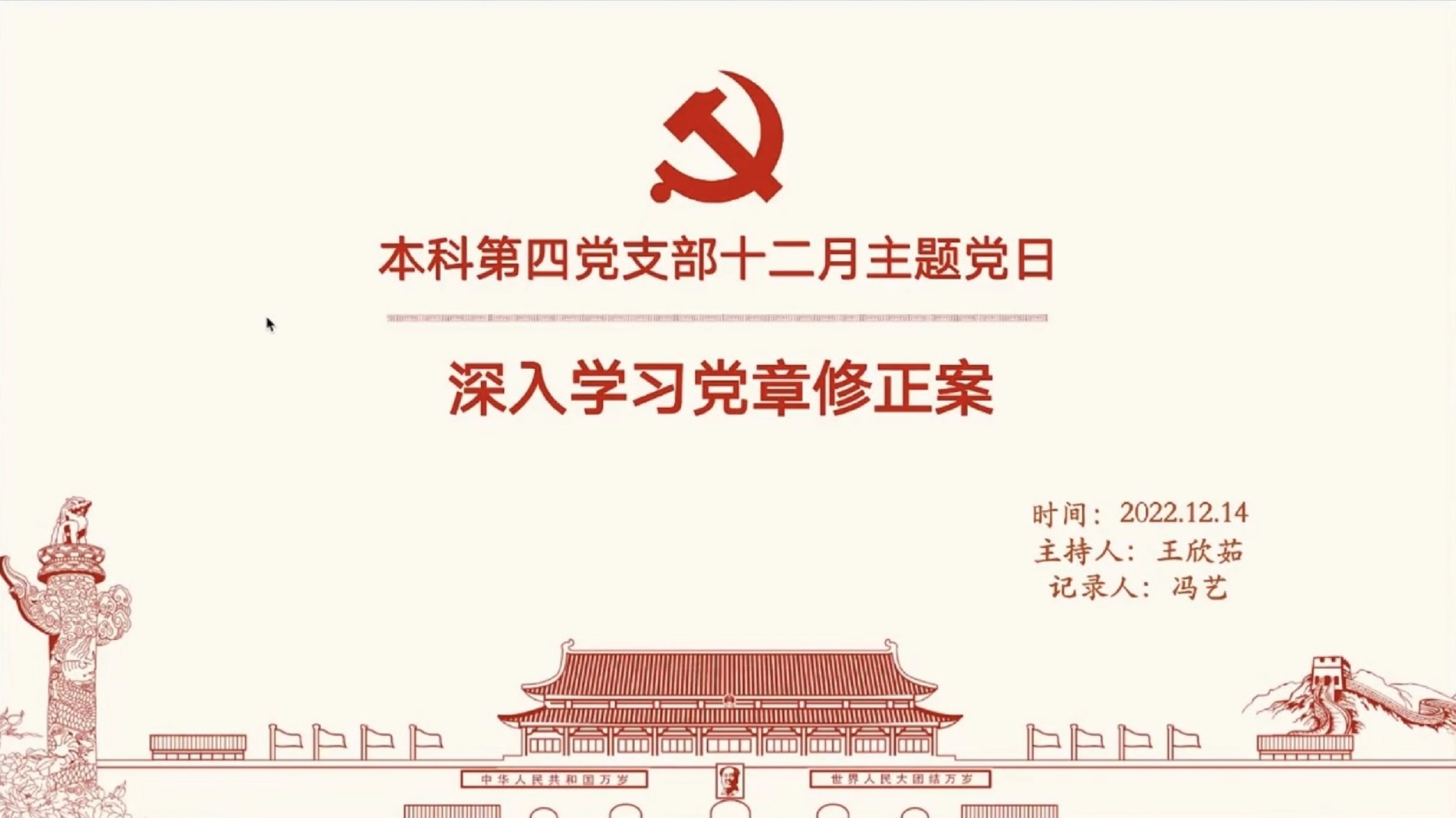 2022年12月14日下午14时,WilliamHill体育本科第四党支部开展“深入学习党章修正案”主题党日活动,重温党章历史,领会党章精神。会议由党支部副书记王欣茹主持,支部全体党员和若干积极分子参加会议。劳动人事公司党委委员、本科第四党支部理论学习导师周文霞出席会议并进行指导。