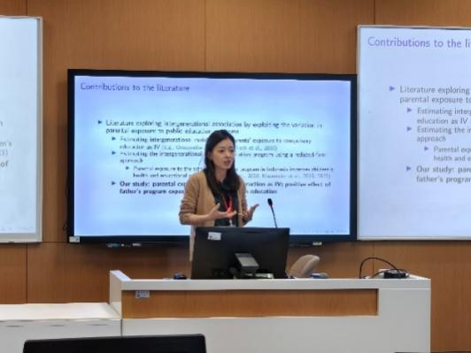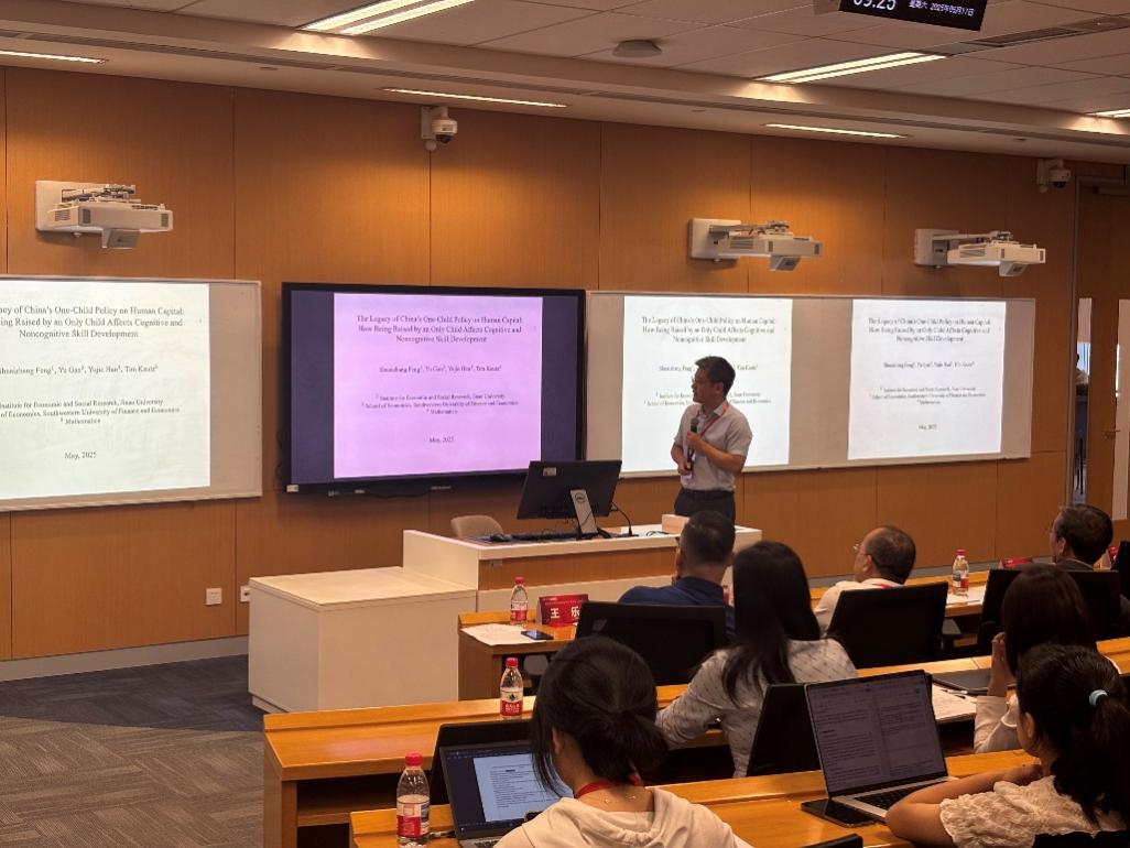 随后,暨南大学经济与社会研究院经理、乡村振兴研究院经理冯帅章教授分享了题为“The Legacy of China’s One-Child Policy on Human Capital: How Being Raised by an Only Child Affects Cognitive and Noncognitive Skill Development”的研究成果。该研究探讨了计划生育政策下作为独生子女的父母对其子代人力资本的影响。研究采用四川绵竹儿童发展面板研究数据,以父代出生相较于计划生育政策施行的间隔时间进行模糊断点回归实验设计。研究发现,独生子女父母对其子代的认知能力和非认知能力具有正向影响,作用的潜在机制包括三个方面:第一,子代具有优势的出生体重和出生身高;第二,子代具有较好的家庭环境,涉及父母的受教育水平、父母的外出务工经历、和家中兄弟姐妹的数量;第三,父代对子代进行较多的教育投资和时间投入,并且选择有益的养育方式。