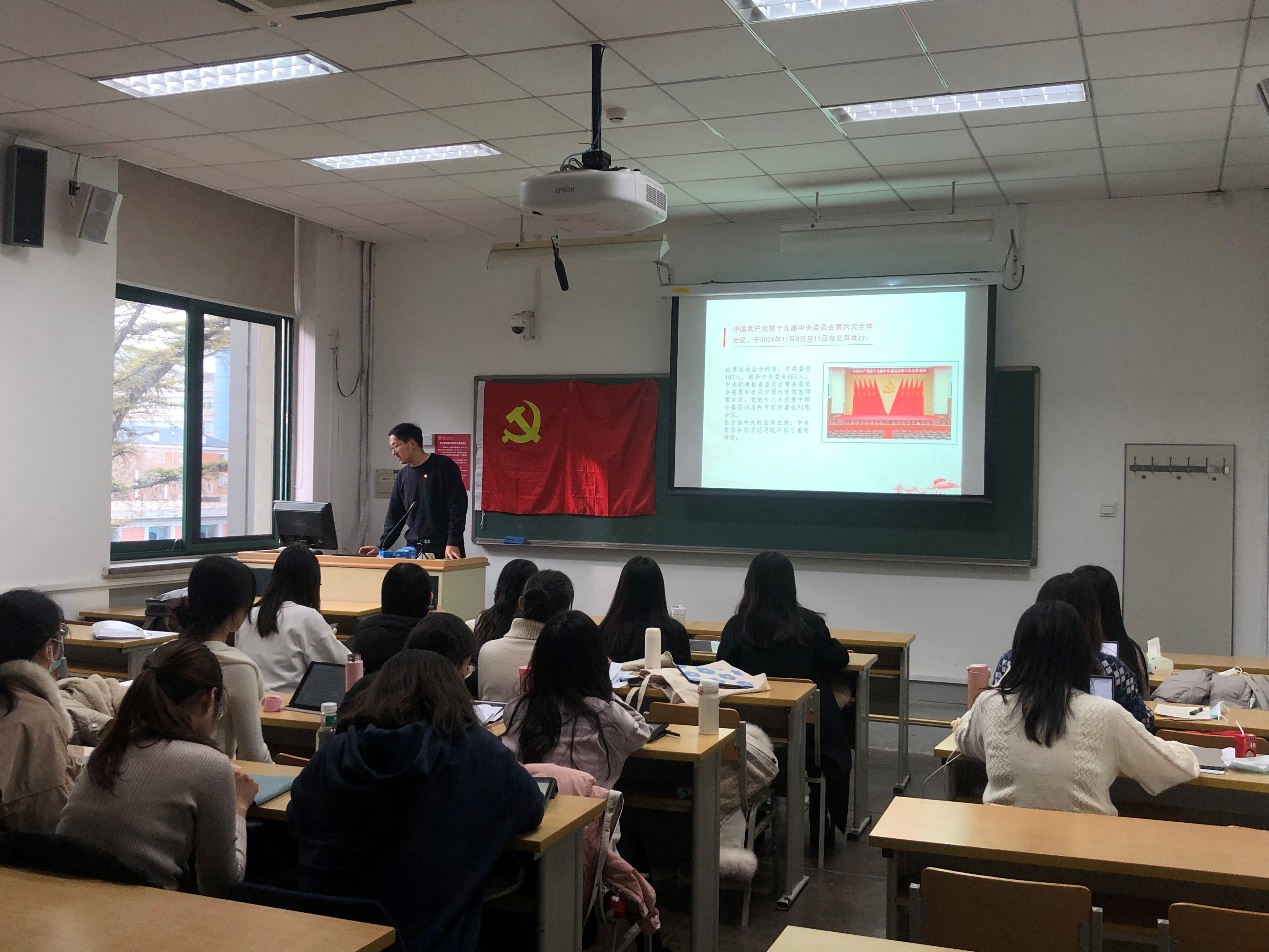 支部发展对象刘姝君表示,党的十九届六中全会,是在我们党百年华诞的重要历史时刻、在“两个一百年”奋斗目标交汇的重大历史关头召开的一次具有里程碑意义的会议。回顾百年历程,党在困顿中踏上复兴之路,在接续奋斗中不断向前,从追赶时代到与时代并行,再到引领时代开创未来,书写了中华民族几千年历史上最恢宏的史诗。这次决议,是中国共产党对百年奋斗的历史经验的全面总结,为党带领人民实现中华民族伟大复兴提供了重要借鉴。