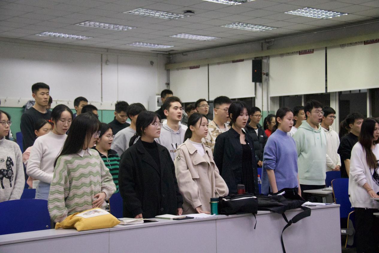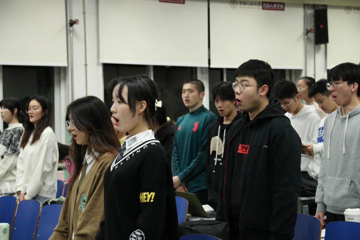 稍顷,大白老师来到0440,排练正式开始。同学们在一遍又一遍的练习中不断优化发声的技巧,修正节奏的偏差,强化各声部之间的配合。歌声在0440教室久久回荡,尽管排练的过程十分漫长,大家仍然在一次次的进步中倍感收获的喜悦。