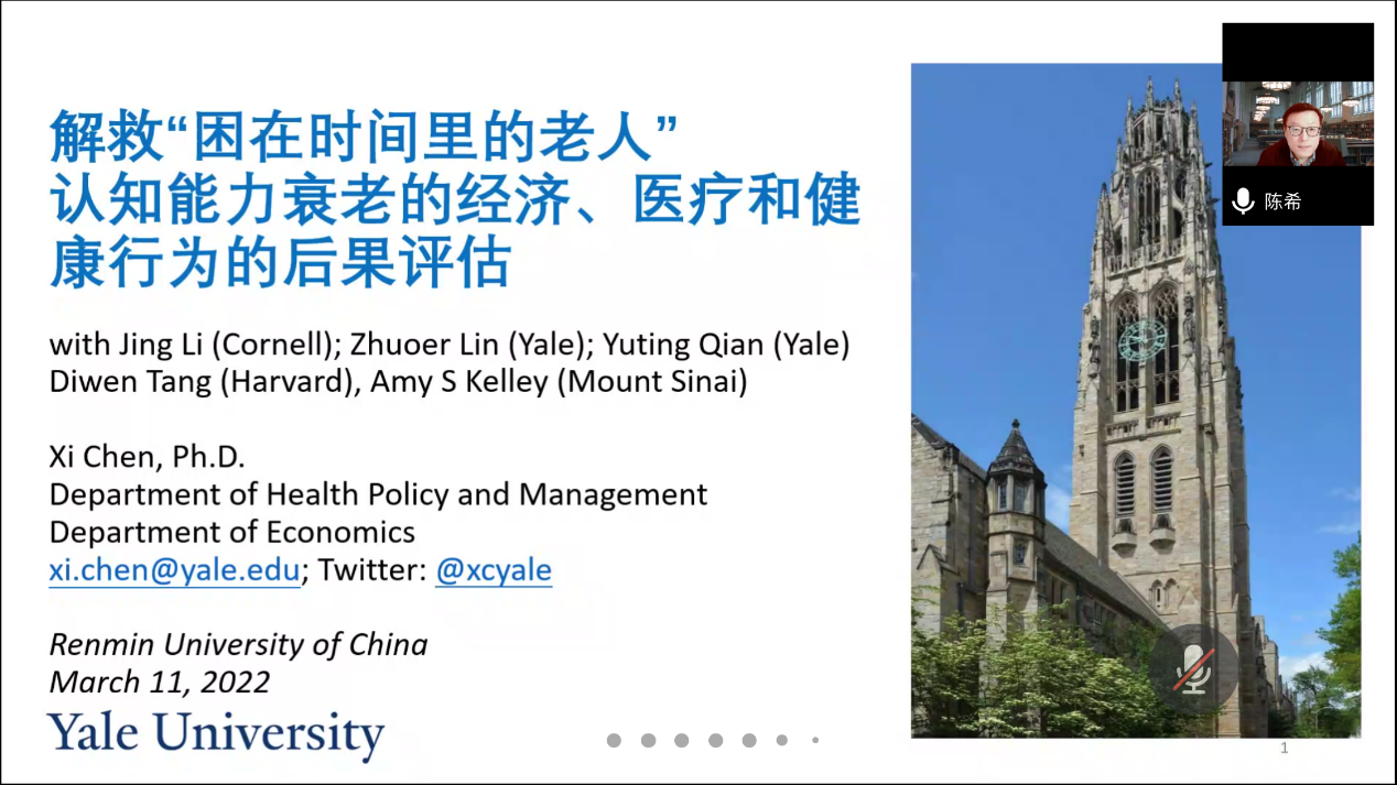 WilliamHill体育社会保障半月谈第57期于2022年3月11日(星期五)上午10:00至11:30,通过腾讯会议的线上会议室成功举行。来自耶鲁大学公共卫生公司的陈希副教授进行了题为“解救‘困在时间里的老人’——认知能力衰老的经济、医疗和健康行为的后果评估”的学术分享。本次学术讲座由WilliamHill体育社会保障系王天宇副教授主持,郭瑜教授、刘宏教授、刘凯副教授、李乐乐助理教授等、硕博研究生和校内外专家学者共80余人参加了此次活动。