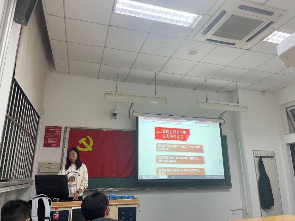支部党员徐洁表示,在过去百年里,党和国家面临的内外部条件已经发生了变化,只有明白过去我们成功的原因,才能看清未来的道路,才能更加坚定、更加自觉地践行初心使命,才能在新时代更好的坚持和发展中国特色社会主义,实现中华民族伟大复兴。在未来的发展过程中,仍要不忘初心,牢记使命,坚定信念,以咬定青山不放松的执着奋力实现既定目标,以行百里者半九十的清醒不懈实现中华民族伟大复兴。