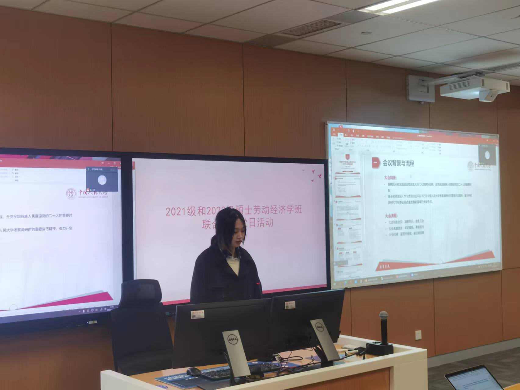 会议进行第二项议程,2022级硕士劳经班宣传委员杜艺璇对公司第十五次党代会的基本情况进行介绍,带领大家学习本次会议主题、会议流程、党委工作报告等。