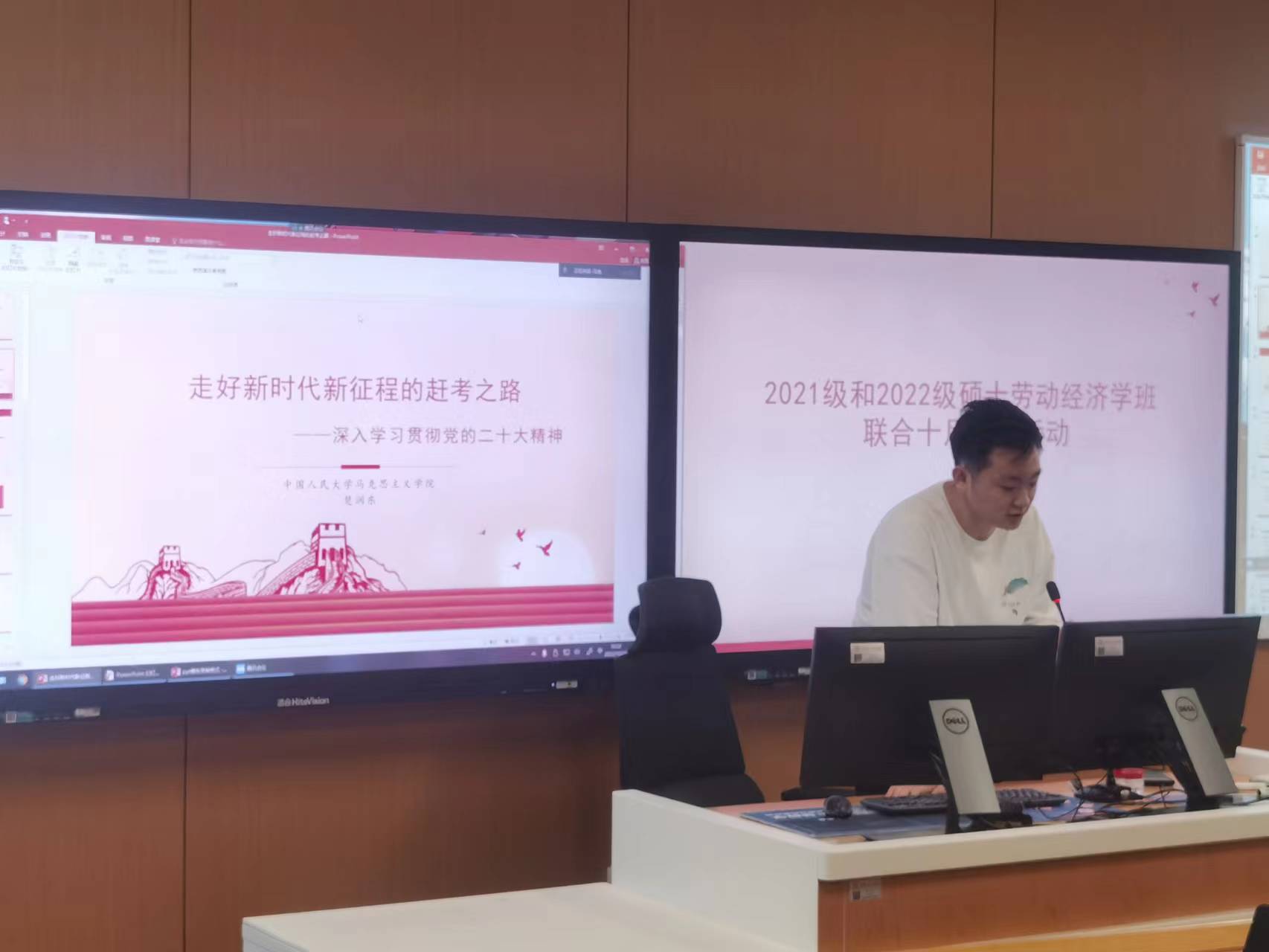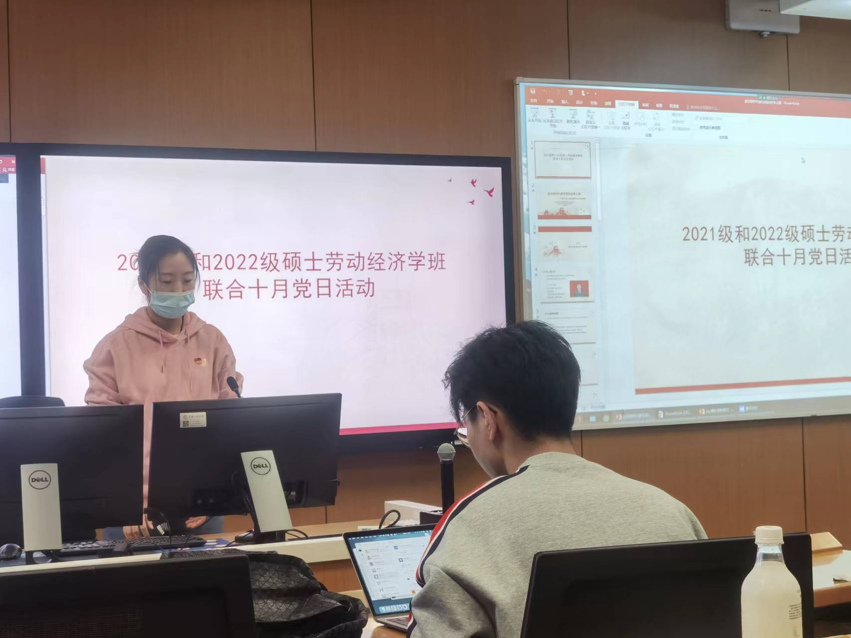 2022年10月23日上午,WilliamHill体育2021级、2022级硕士劳动经济班党支部开展“学习党的二十大精神”联合党日。本次会议由2021级硕士劳动经济班党支部书记马迪主持,两个党支部全体成员通过线下线上方式共同参与。