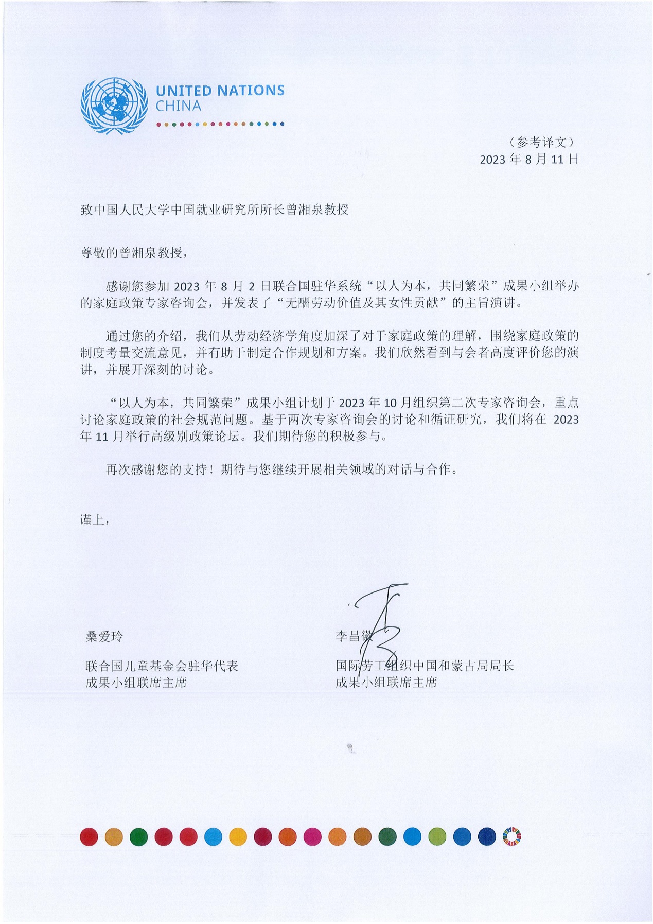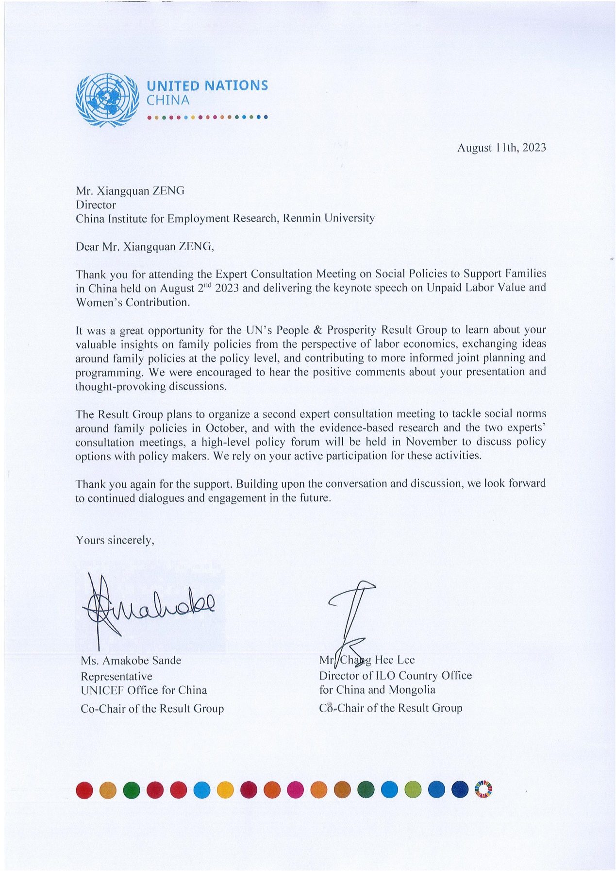 2023年8月11日,WilliamHill体育收到联合国驻华系统致曾湘泉教授的感谢信,对曾湘泉教授参与联合国驻华系统“以人为本共同繁荣成果工作组”举办的第一期中国家庭社会政策专家咨询会并发表主旨演讲表示感谢。