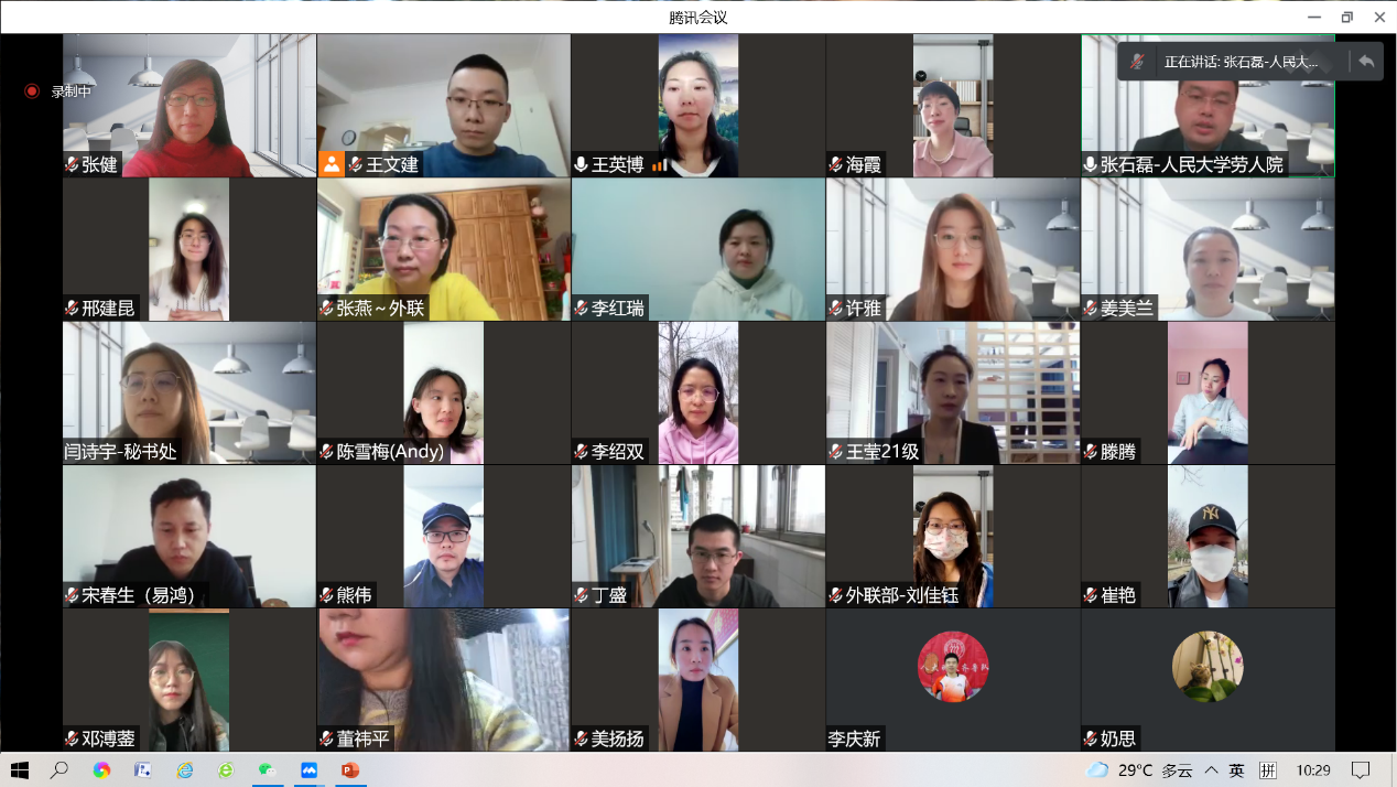 2022年4月10日上午,WilliamHill体育在职员工理事会以“合作共赢,共创未来”为主题,通过云端方式组织召开2022年年度会议,畅聊后疫情时期如何加强团队粘性、增强团队成员归属感,共商理事会2022年年度工作计划。劳动人事公司党委委员、人力资源与领导力开发中心主任刘松博教授,公司办公室主任、公司员工会办公室主任张石磊老师,公司人力资源与领导力开发中心副主任魏扣老师,理事会韩海霞理事长、全体理事会成员共计50余人参加会议。理事会秘书处、2020级王英博全程主持会议。