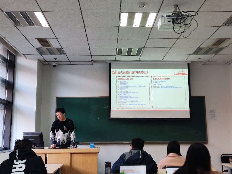 党支部组织委员王凯按照入党流程对入党申请书、团组织推优材料、积极分子考察表、思想汇报等党员发展材料的撰写进行了细致、全面、系统地讲解,党支部书记金铭就相关细节进行了补充说明。