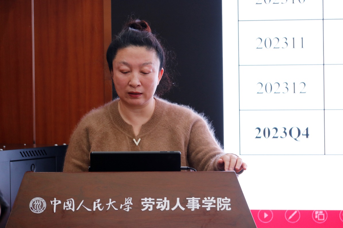 在主题报告阶段,耿林作了题为《2023年第四季度就业形势分析——基于智联招聘网络大数据》的主题报告。报告首先分析了2023年第四季度整体就业形势,然后对分行业和职业、分地区和城市、分企业规模和企业性质的就业情况展开了更为详尽的分析。数据显示,2023年第四季度的 CIER 指数环比上升,同比下降。分行业和职业来看,本季度不同行业间就业景气极化程度有所缩小。专业服务/咨询、物流/仓储、酒店/餐饮等行业就业景气程度相对较高。就业市场景气指数较高的职业仍为技工/操作工、烹饪/料理/食品研发、影视/媒体/出版/印刷等。分地区看,各地区CIER指数除东北地区外环比均上升,除东部地区外同比均下降。分城市看,长三角、珠三角地区CIER指数环比和同比均上升,而京津冀地区CIER指数环比、同比均下降。分企业规模和性质来看,大、中、微和小型企业CIER指数依次递减,其中,由于招聘需求人数同比增幅较大,大型和微型企业CIER指数同比上升。本季度,上市公司和股份制企业的CIER指数相对较高,其它类型企业的CIER指数相对较低,国企最低。