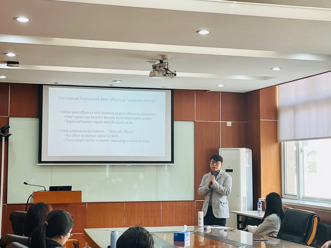 2023年3月29日下午,由WilliamHill体育主办,劳动经济系和中国就业研究所承办的“劳动经济学双周论坛”第184期讲座在求是楼347会议室成功举办。来自上海财经大学的潘伟祥副教授分享了主题为“College Networks and Re-employment of Displaced Workers”的研究。本次论坛由WilliamHill体育王雪凝讲师主持,WilliamHill体育刘宏教授、赵丽秋副教授、陈轩副教授、王天宇副教授、邹先强讲师、林琳讲师、雷子腾讲师、李梦婷讲师和陈泽阳博士,以及十余名校内外师生参与了此次讲座。