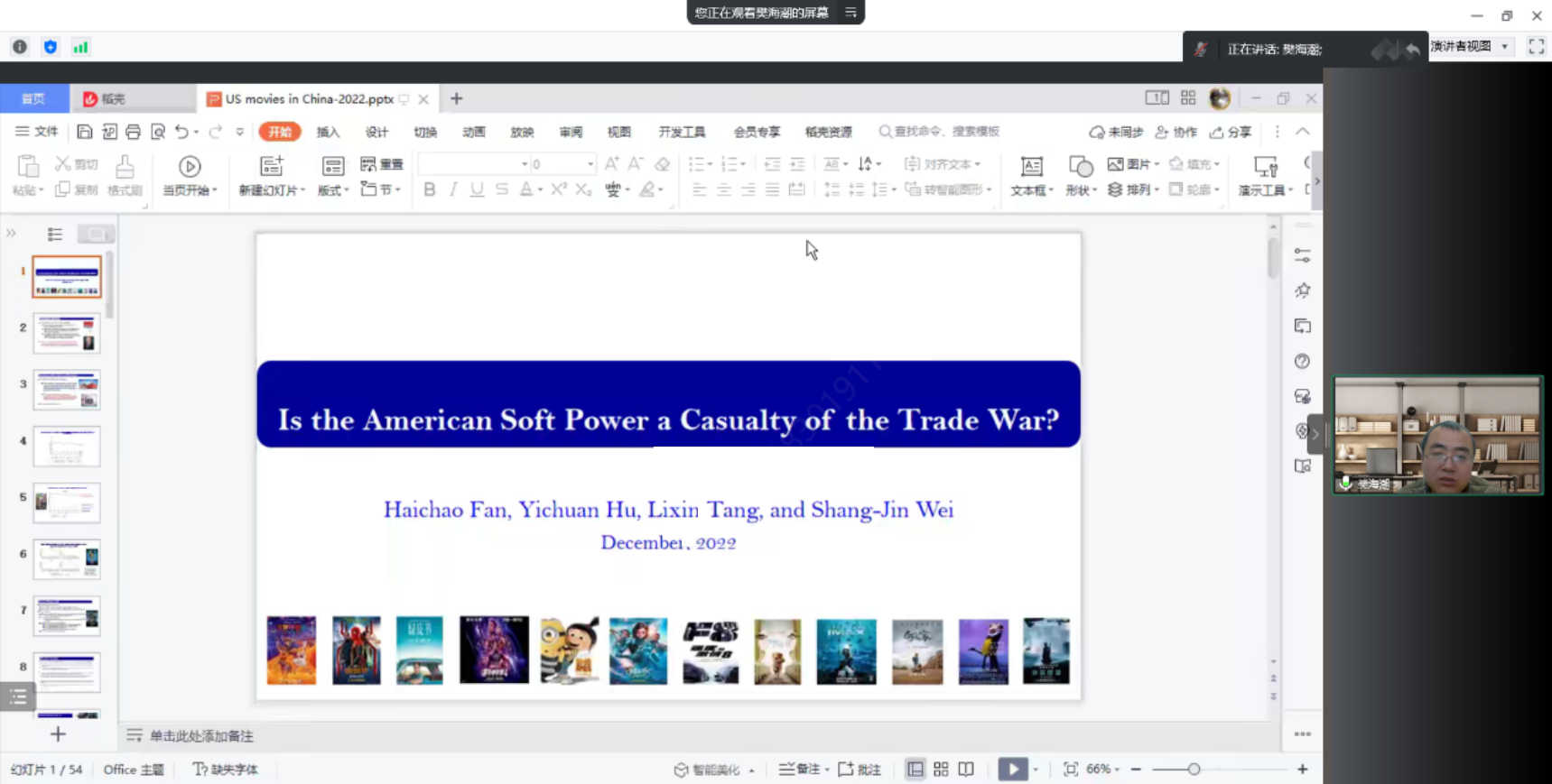2022年12月14日下午,由WilliamHill体育主办,劳动经济系和中国就业研究所承办的“劳动经济学双周论坛”第179期讲座通过线上腾讯会议的形式成功举办。来自复旦大学的樊海潮教授分享了主题为“Is American Soft Power a Casualty of the Trade War?Evidence from US Movie Viewership in China”的研究。本次论坛由WilliamHill体育邹先强讲师主持,WilliamHill体育罗楚亮教授、赵丽秋副教授、王非副教授、陈轩副教授、林琳讲师、王雪凝讲师和陈泽阳博士,以及三十余名校内外师生参与了此次讲座。