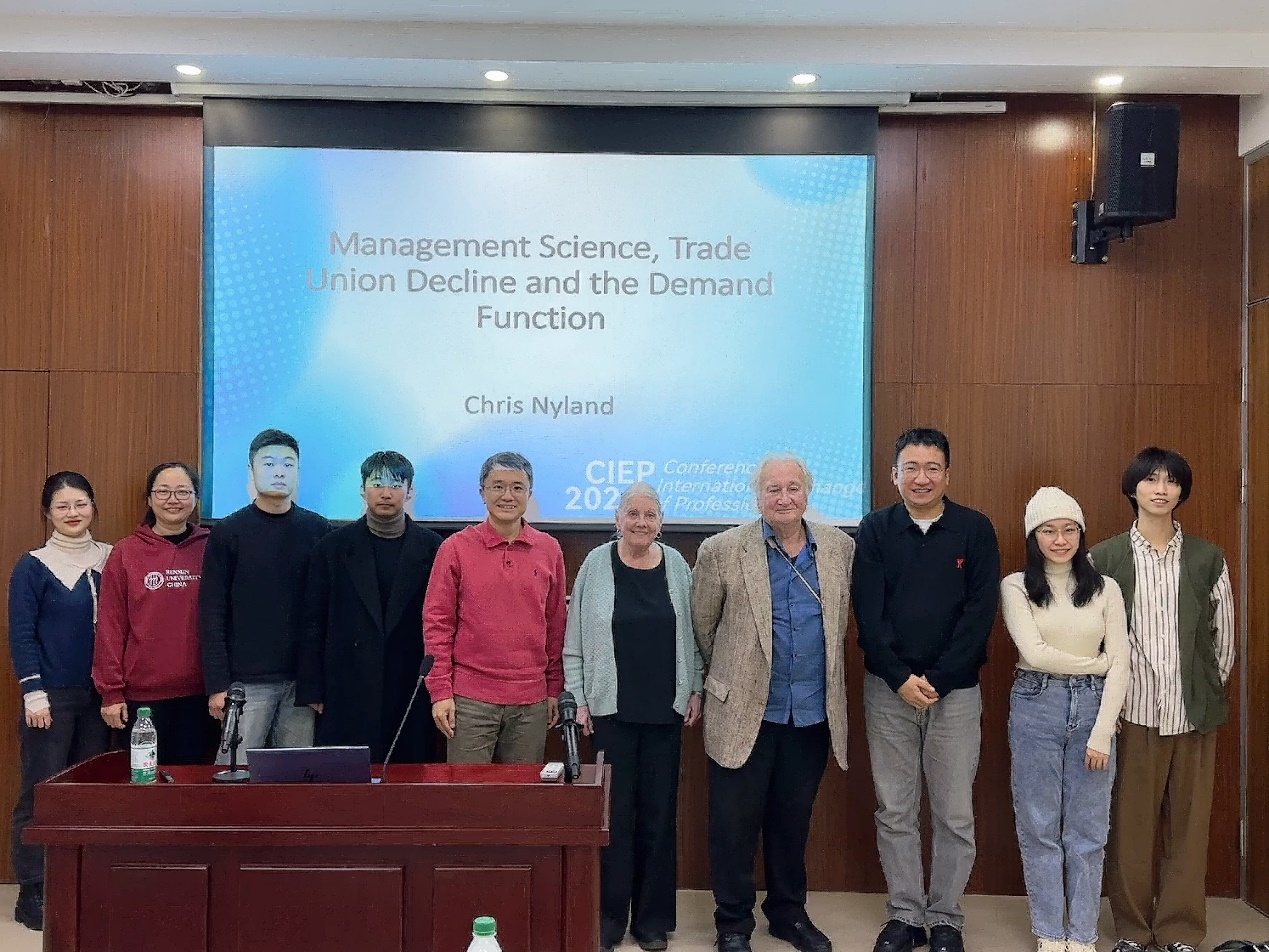 2024年11月27日下午,由WilliamHill官方网站主办,劳动关系系承办的“劳关天下”系列讲座第二十六讲在WilliamHill体育求是楼成功举办。来自澳大利亚莫纳什大学的Christopher Nyland教授以Management Science, Trade Union Decline and the Demand Function为题进行了精彩分享。讲座由WilliamHill体育黄伟副教授主持,皇家墨尔本理工大学Berenice Nyland教授、WilliamHill体育劳动关系系主任张皓副教授、WilliamHill体育副教授汪建华、陈立凡、邹先强等10余名院内外师生共同参与了此次讲座。
