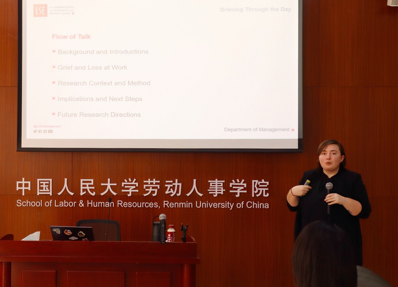 Elizabeth讲师首先介绍了作为研究核心概念的“grief”(悲伤)的定义,并指出以更短的“天”为时间单位分析对分析悲伤情绪对员工工作体验不仅在理论层面而且在管理实践层面均具有创新性。她将员工在白天工作期间因各种因素被唤起的悲伤情绪称为“episodic grief”(偶发性悲伤),构建了以偶发性悲伤体验为自变量,同事关怀与同情、悲伤羞耻为调节变量,工作干扰和工作投入度为中介变量,职业倦怠与工作抽离感为因变量的模型,并利用美国员工数据加以检验。研究发现偶发性悲伤体验确实通过强化员工工作期间受到的干扰增强了员工的职业倦怠感,但并未降低员工工作投入度,也并削弱员工下班后获得的工作抽离感水平。员工的悲伤羞耻感会强化第一条路经,但同事的关怀与同情却并未能缓解偶发性悲伤的消极作用。